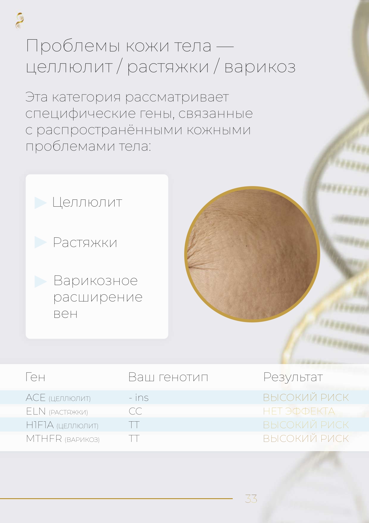 +7 (343) 288-53-19ДНК-тест Skin Care (генетика красоты) помогает понять, как именно ваши гены влияют на состояние кожи и волос. Это не медицинский диагноз, а персонализированный генетический отчёт, который показывает врождённые особенности организма и даёт рекомендации по уходу.